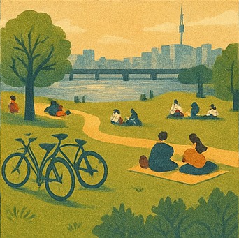 - 분위기: 자전거 타는 사람들, 돗자리 데이트, 강아지 산책 등 다채로운 풍경